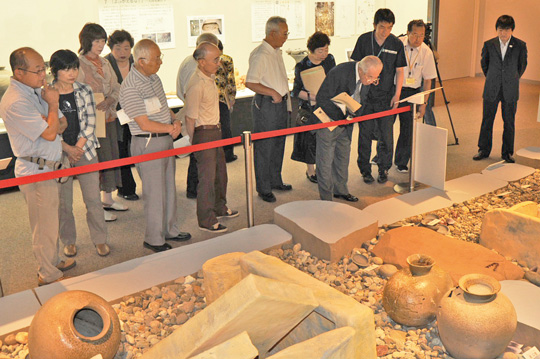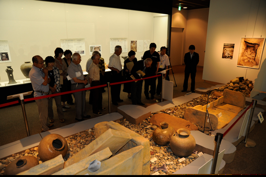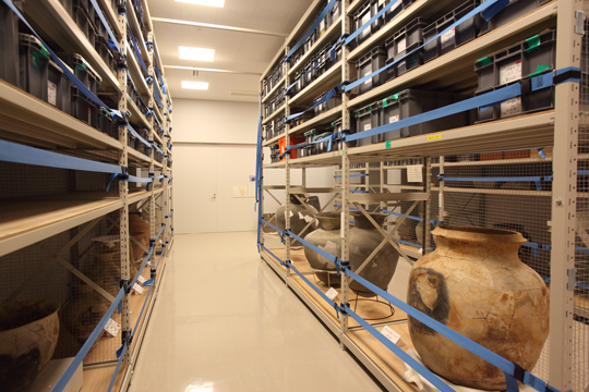 博物館収蔵庫の一部を解放した展示スペースです。出土品が収蔵されている状態を間近で見学することができます。また、大型の出土品が展示してあり、見ごたえがあります。