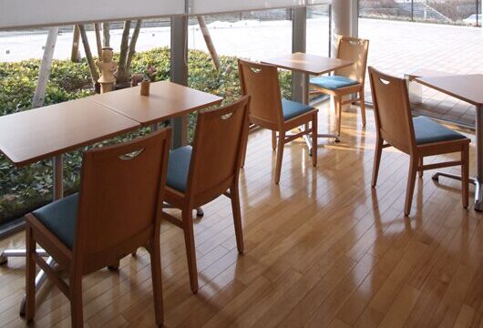 史跡公園に面した休憩コーナーからは公園内の芝生広場が見えます。 春になると公園の梅、桜が咲き誇り、くつろげる空間となっています。